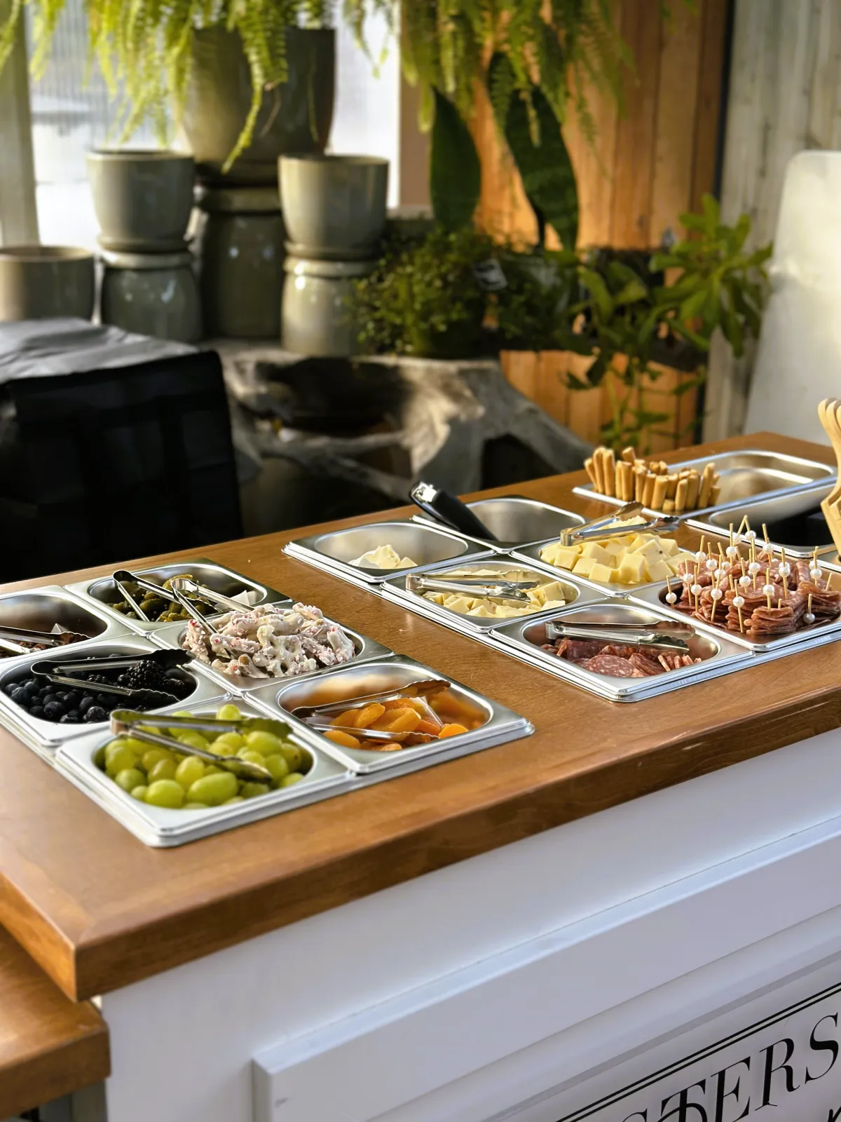 Easy roll in and set up. Our cart includes charcuterie styling, décor, utensils, eco-friendly serveware, and signage tailored to your event theme. Requirements for our set up depend on whether it's a public or private event. We can usually get set up in less than hour for most events.